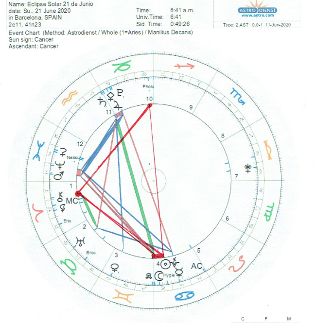 Para la Luna Nueva a 0º de Cáncer, que también es un eclipse de Sol del 21 de Junio, muchas más cosas, se harán evidentes, a pesar que para los eclipses de Sol, éste se oculta, esto pondrá más énfasis en las situaciones de las raíces de nuestros problemas familiares e históricos, como ya estamos viendo. El origen del racismo, del colonialismo, del “colonizar” y sus consecuencias son algunas de las cosas que de repente están siendo más obvias, para que comencemos a cuestionar “Venus y Mercurio retrógrados” esos valores y actitudes que por siglos hemos mirado sin mirar. Para este eclipse, el Sol y la Luna están en conjunción a Hygiea y Vesta, opuesto a Pholus y en cuadratura a Kirón y también Marte-Neptuno. Los engaños del pasado se destapan, y es posible que veamos un aumento de casos de Covid19 debido a las tan justificadas manifestaciones en el mundo entero. Los primeros grados de los signos cardinales son de gran potencia y llamado a la acción. Siendo Libra el signo que completa esa cruz cardinal, quizás este es el momento de “demandar” un compromiso, un puente que nos empuje a transitar estos caminos tan divididos que estamos viviendo, para que podamos no sólo luchar, pero también encontrar algún tipo de solución a estos problemas ancianos. Aunque Marte todavía está envuelto por cuadratura en este eclipse, esta vez no forma una t-cuadrada al Sol y la Luna como en el eclipse anterior en Sagitario, por tanto es posible que aunque la tensión continúa, esta vez será con más posibilidades al diálogo.