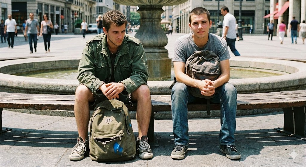 Él apareció sin que lo notara. Se sentó a mi lado como si ya nos conociéramos. Tenía una mochila también, raída, con los cierres rotos y una mancha de pintura azul en el costado. Llevaba los zapatos gastados y la mirada limpia.